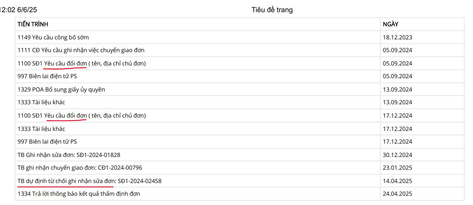 The history of requests and documents submitted regarding the