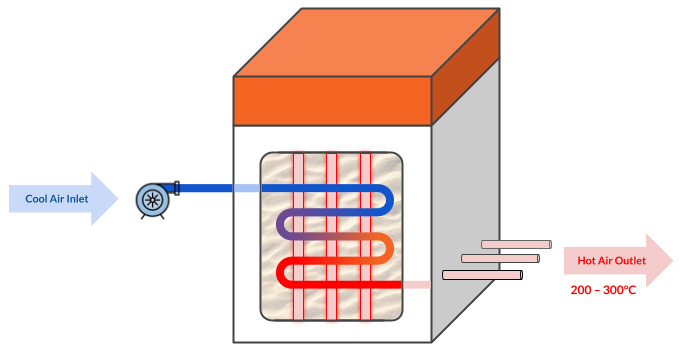 When we need to discharge the heat energy, we can turn on the fan, which pushes normal air, through a series of metal tubes inside the core sand block. This long network of tubes strategically positioned inside the sand, allows the air going through it to heat up by absorbing the heat from sand.