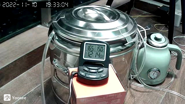 3. Using the heat, getting warm water: In the setup I also run a copper tube inside the hot sand, I just happened to have an extra tube from an old air-con, and I bent it with my own hands, submerge in sand and connect the PVC tubes on the 2 ends. By circulating normal water through the core block of the sand battery, using regular aquarium water pump, I actually got warm water in the kettle at ~60°C. But of course, this does not last for long, the temperature will drop gradually once it reaches peak. Total experiment lasted about two hours, before everything went back to normal temperature.