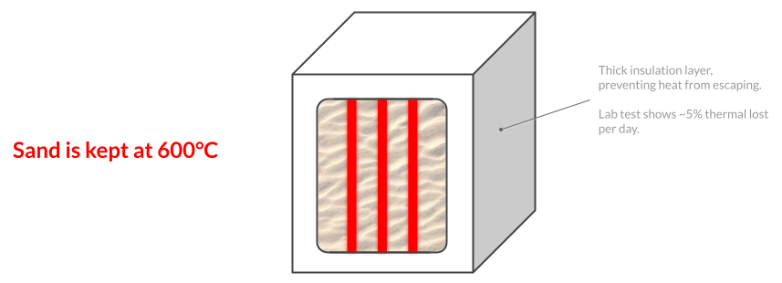 It sounds simple but in reality, having 600°C on one side, and normal room temperature outside the box is pretty challenging. This aspect of the thermal energy storage solution, the science of material, is the most crucial factor of the whole solution, in my perspective. The ability to store the heat at high temperate, with minimal daily losses determines the capacity of the battery, the higher the temperature, the larger the thermal capacity.