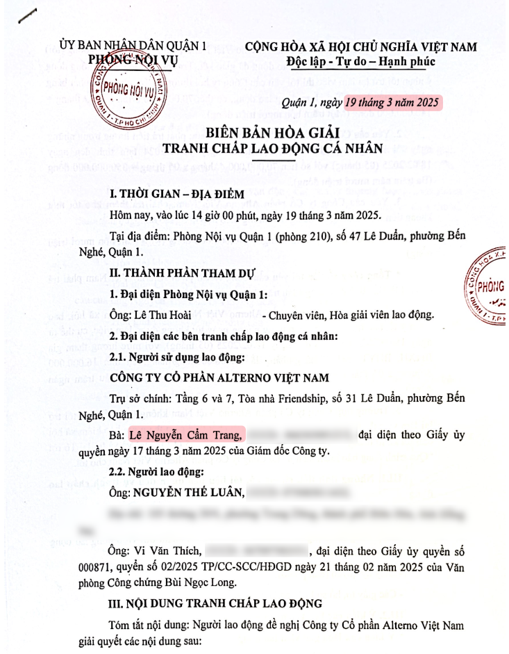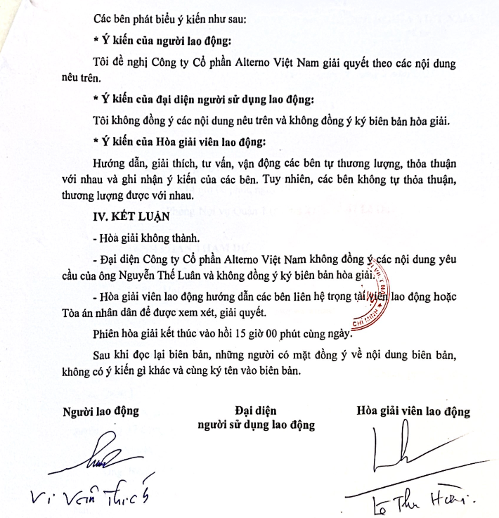 Fast forward several months. On March 19th, 2025, a formal mediation session was held, attended by my attorney and a representative from Alternō Vietnam, Le Nguyen Cam Trang. The mediation proved unsuccessful in reaching a resolution. Tellingly, Ms. Trang refused to sign the official mediation document, although the document itself remains a valid record of the proceedings.