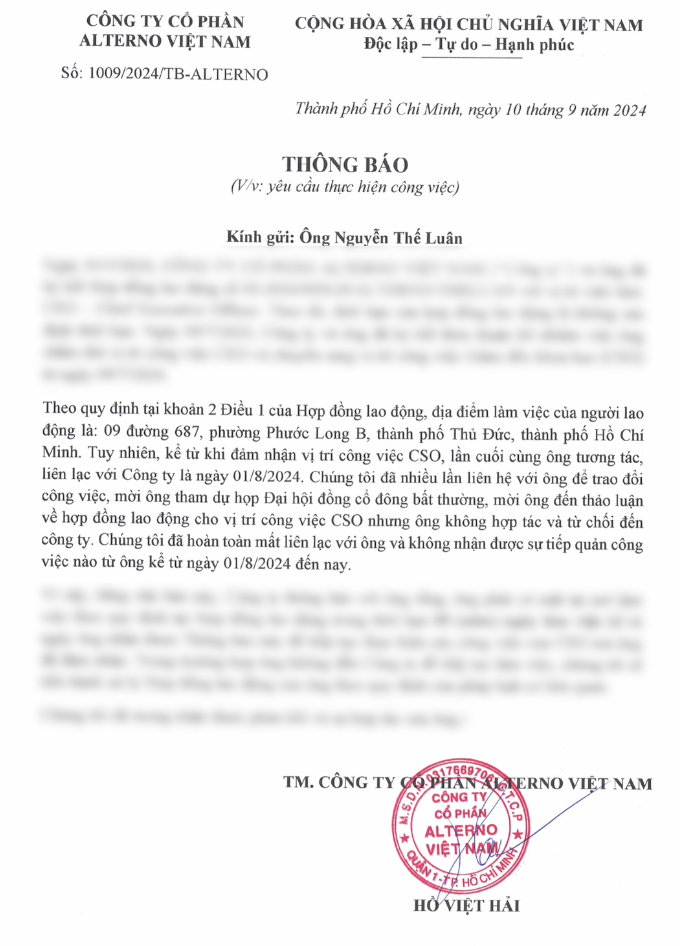 The situation escalated rapidly despite my efforts to engage constructively. On September 10th, 2024, I received an official notice from Alternō Vietnam. Shockingly, it claimed the company had been unable to contact me since August 1st, 2024. This was demonstrably false, given my physical presence and active participation in the AGM on August 8th, and my documented communication attempts and investor conversations throughout August. This notice felt like a manufactured pretext, laying the groundwork for further action, indeed it was.